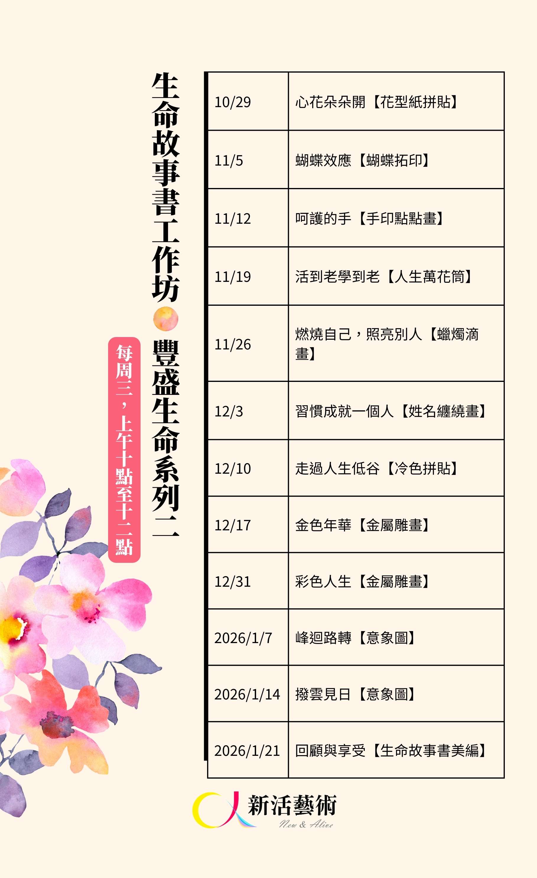- 日期:2025/10/29-2026/1/21,總共12次團體(上課日期:10/29、11/5、11/12、11/19、11/26、12/3、12/10、12/17、12/31、1/7、1/14、1/21)